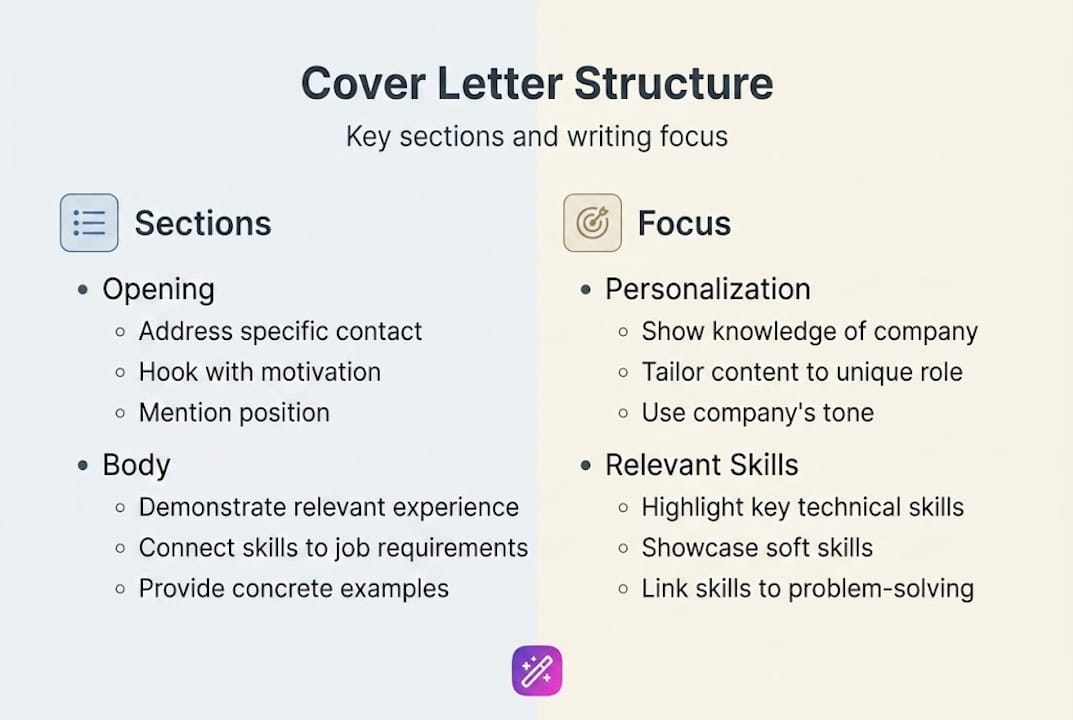 - Opening hook: Lead with something specific. Name the role, mention a recent company initiative you admire, or open with a result you achieved that's directly relevant.